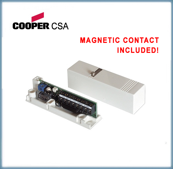 Sensore piezoelettrico CSA Cooper per la rilevazione di vibrazioni e urti con contatto magnetico incluso. Doppia soglia d'intervento, Connessione a morsetti, protezione antimanomissione (tamper), sensibilità regolabile, provvisto di memoria a LED.Adatto ad ambienti interni. CSA 447-C